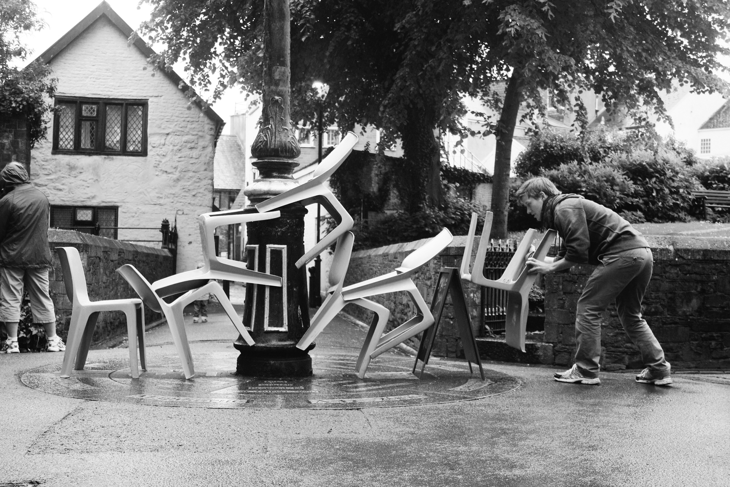 …And…Here…And…There…And… is a constantly evolving environment, taking place in the public sphere. Asking for interruptions and dialogues. This 8 hour durational site-work is constantly evolving its own and the surrounding landscape, by moving twenty chairs around, into various formations. Simultaneously pedestrians and people passing by are invited to have a seat and enjoying the view and landscape around them.